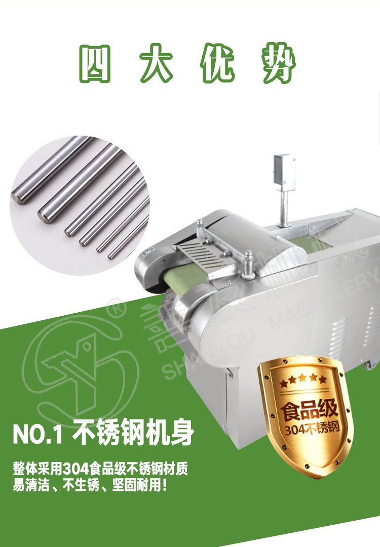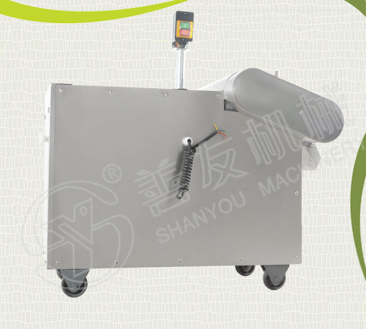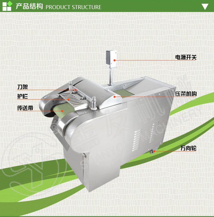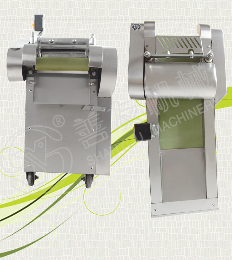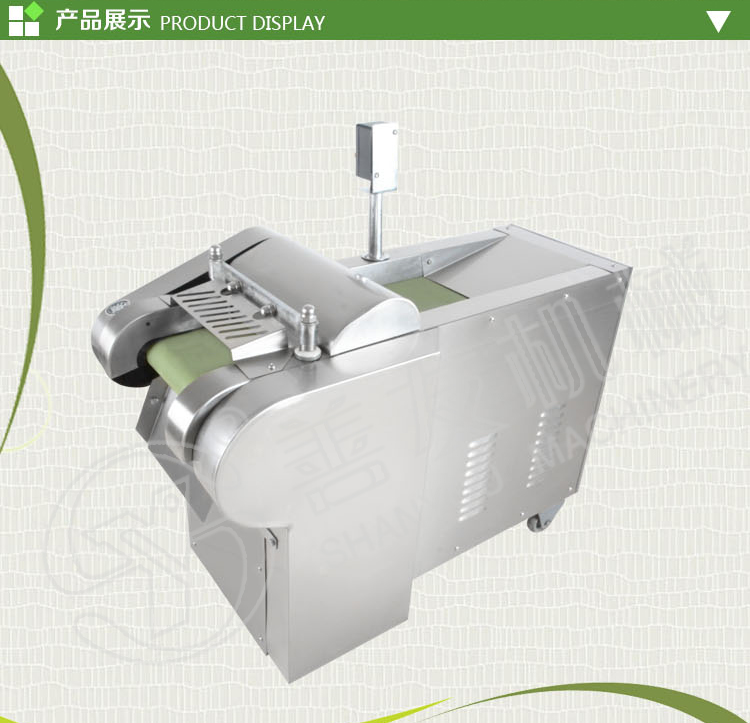 主要由机架,输送带,压菜带,切片机构,调速箱或塔轮调速机组成,用于瓜薯类硬菜的切片,片厚可在一定范围内自由调节,竖刀部分可将叶类软菜或切好的片加工成不同规格的块,丁,菱形等各种形状。切菜长度通过“可调偏心轮”在一定范围内任意调整。因竖刀模拟手工切菜原理,加工表面平整光滑,成型规则,被切蔬菜组织完好,保持新鲜。