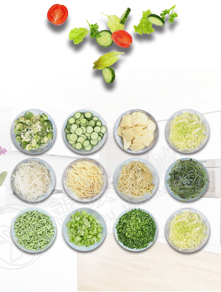 切菜机采用100%铜线电机,不锈钢机身,经久耐用,切丁切丝的厚度在1-10毫米内自由调整。采用竖刀以及用离心切片机头,先把物料切成片,再根据需要调节,然后切成所需规格的丝或曲线、块、丁、菱形等花样!