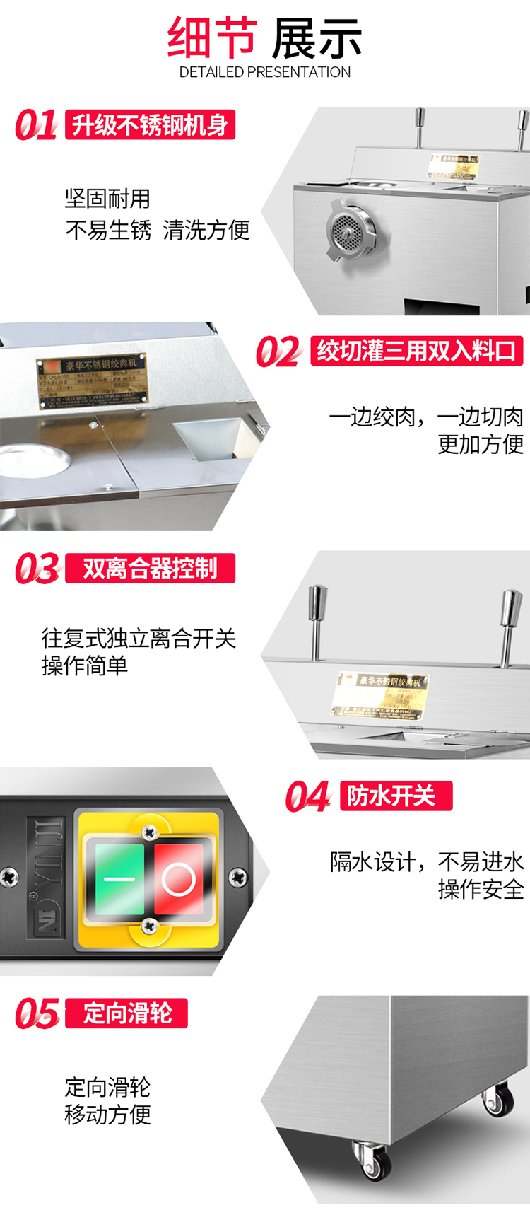 本机最大的优点是各自配置电机,省电耐用,方便快捷。具有结构紧凑,外型美观,操作简便,效率高,耗电少,清洁保养容易,安全卫生等特点。是宾馆、酒家、肉类加工场,工厂、部队、机关食堂等单位加工无骨肉类的理想加工机械。